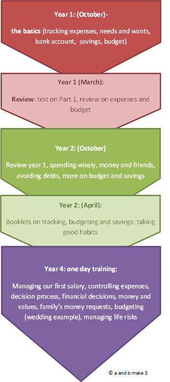 Basic tools are introduced straight away (tracking expenses, using a bank account, budgeting, envelope method…) and reviewed in all the following sessions. The follow up sessions and Year 2 and 4 also focus on how to change behaviour, decisions and values- especially the place of money in our lives and how to deal with family’s money requests.